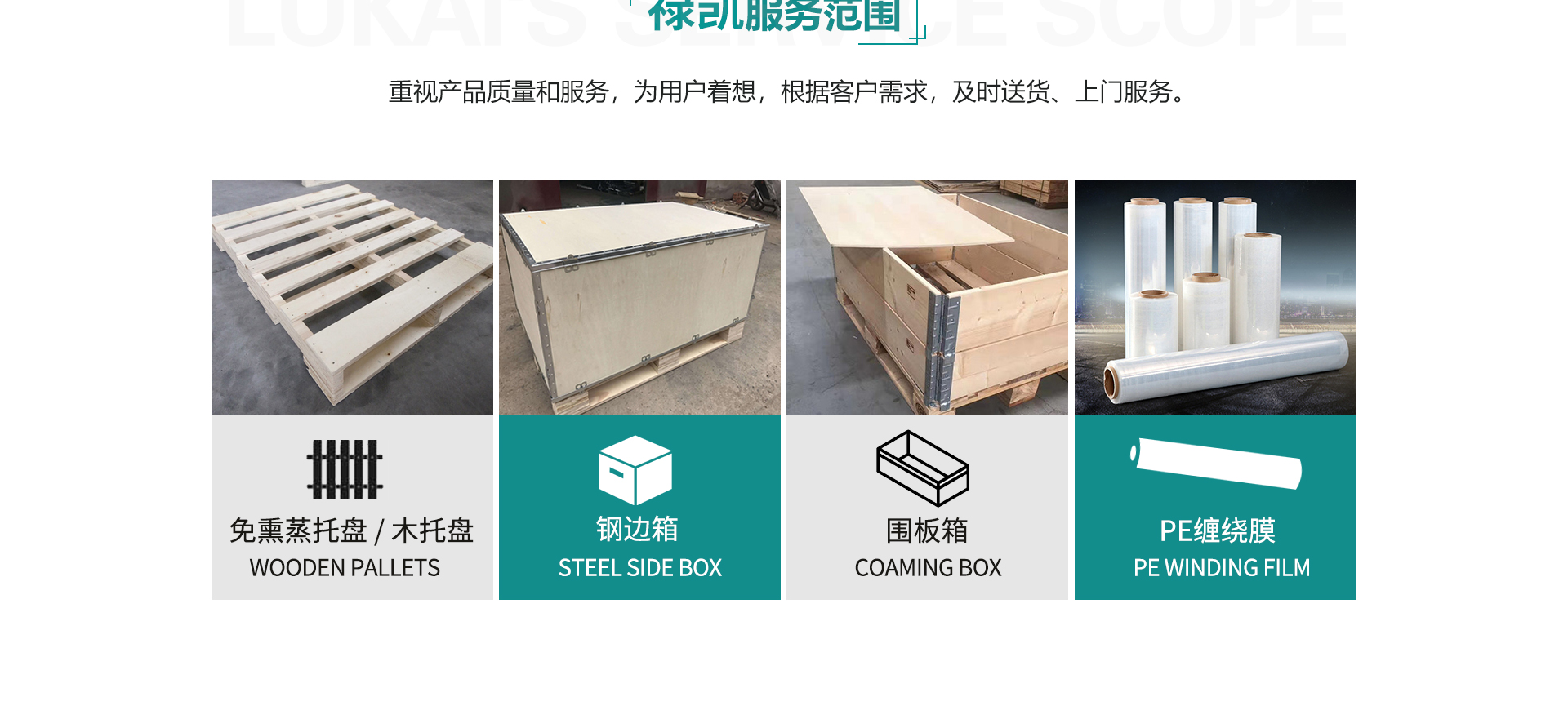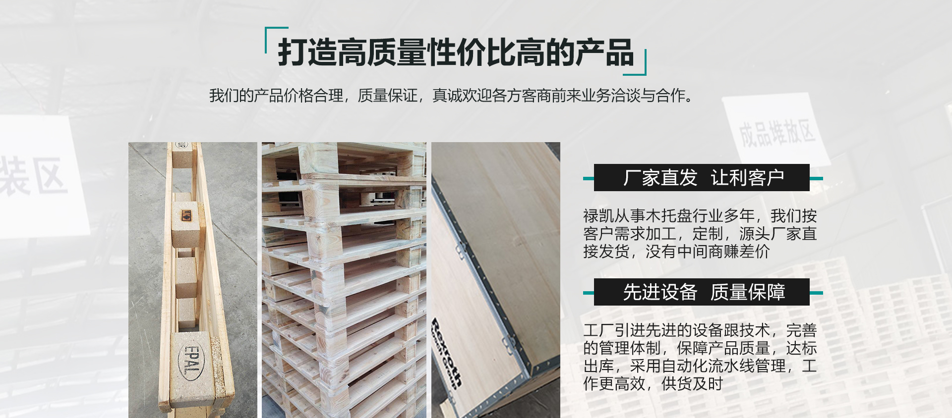 安徽祿凱包裝科技有限公司是一家專注集研發(fā),生產(chǎn),銷售,租賃木托盤。免熏蒸托盤,歐標(biāo)托盤、熏蒸木托盤、圍板箱,鋼邊箱,纏繞膜等產(chǎn)品。公司本著“以質(zhì)量求生存,以信譽(yù)謀發(fā)展”的經(jīng)營(yíng)理念;重視產(chǎn)品質(zhì)量和服務(wù),為用戶著想。根據(jù)客戶需求,及時(shí)送貨。公司始終堅(jiān)持以“市場(chǎng)”為導(dǎo)向,以“人才”為根本,以“顧客”為上帝的經(jīng)營(yíng)理念;以“質(zhì)量為首、誠(chéng)信為本”的方針,尊循“不斷創(chuàng)新,追求完善”為宗旨。本著生產(chǎn)廠家,減少中間流通環(huán)節(jié)的原則,讓利于每位客戶朋友。我們的產(chǎn)品價(jià)格合理,質(zhì)量過硬,真誠(chéng)歡迎各方客商前來業(yè)務(wù)洽談與合作。